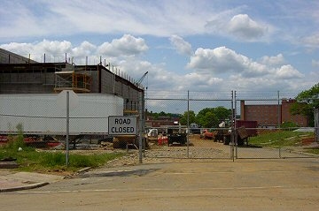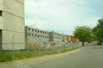 Looking southeast from Virginia Avenue at the barracks construction, with the Capper Senior apartment building in the background. (06/03)