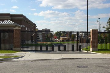 Looking west into the barracks construction area from 7th Street, just south of its intersection with Virginia Avenue. The driveway is actually K Street (which will not be reopened), and the now-demolished Capper Apartment buildings at the far right. (05/03)