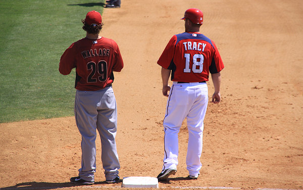 The Astros' Brett Wallace at 1st with Chad Tracy. They look strangely short in this photo, even though they're both over 6 feet tall.