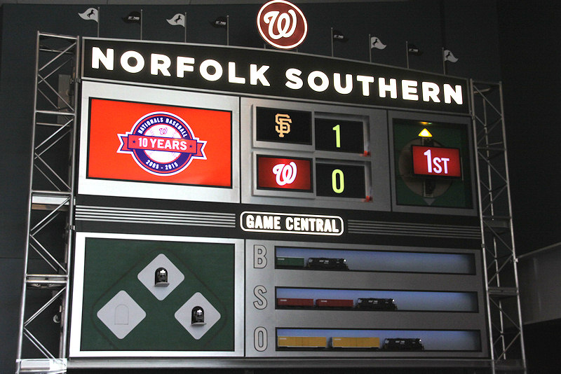 The new Norfolk Southern Club includes this scoreboard that updates in real time and uses nine different trains to show the score, the baserunners, and the pitch count.