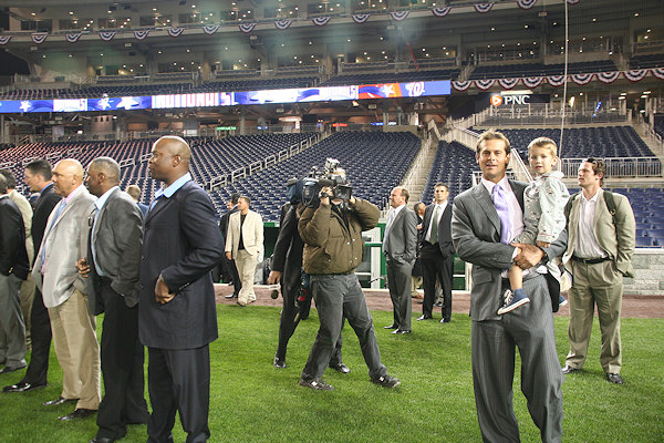 Aaron Boone and his son (right), check out the ballpark along with other players.