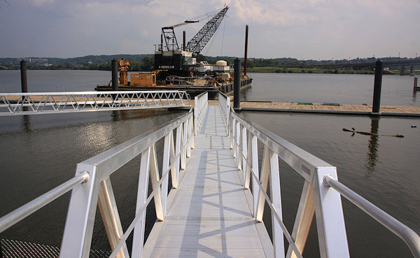 Heading down the walkway to the floating boardwalk. The construction barge at rear is due to depart soon.