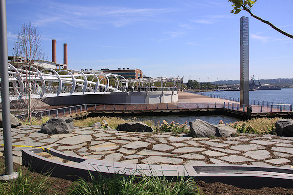 The view of the pedestrian bridge, the light tower, the boardwalk, and more, looking east toward the Navy Yard.