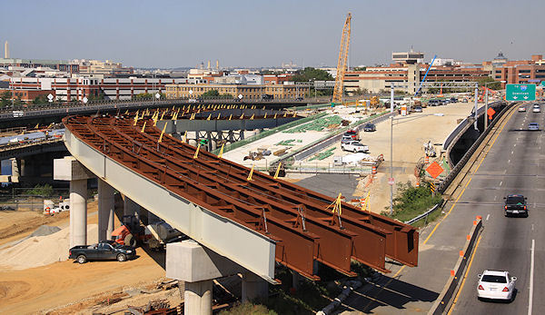 The two freeway bridges, and the new ramp that will take outbound traffic to the northbound DC 295 freeway. At right is the existing inbound 11th Street Bridge. You can also see, at the spot where the barrels are just beyond the girders, where a ramp from southbound 295 to the inbound freeway bridge will be built, though it must wait for the existing inbound bridge to be closed.