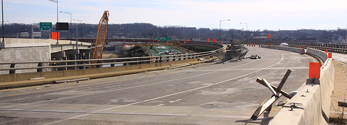 The new bridges at far left, then the under-construction 11th Street Local bridge at center, and the old outbound bridge, which is still being used for traffic coming up from 11th and N SE (in the far-right lane) to go over to MLK, Howard Road, and Anacostia Park. (I just walked up the sidewalk to get here, nothing nefarious. It's a lot less nervewracking now!)