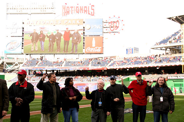 Local Advisory Neighborhood Commissioners from district 6D get their moment in the sun, both on the field and on the scoreboard. Waving to the crowd are (from left) Roger Moffatt, Rhonda Hamilton, Ron McBee, Max Skolnik, David Sobelsohn, and Robert Siegel.