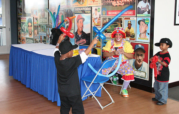 Kids and balloons and a clown, with the Senators baseball card display at rear. (link)