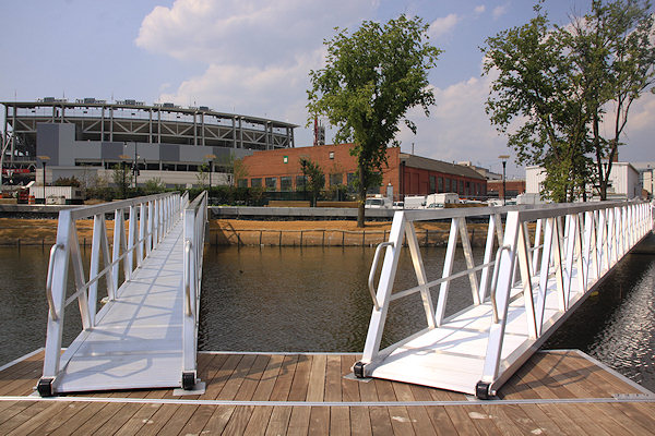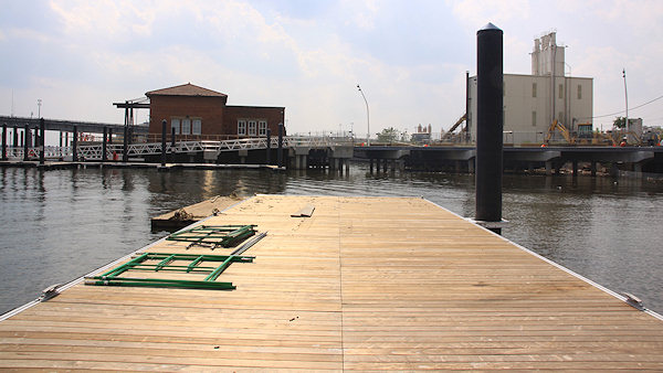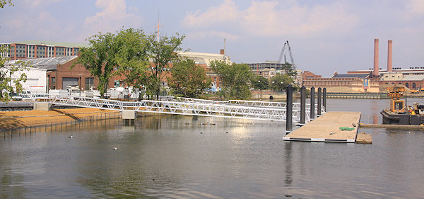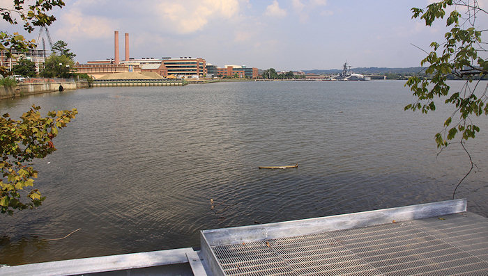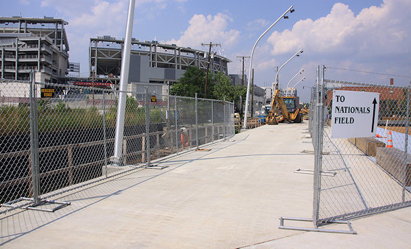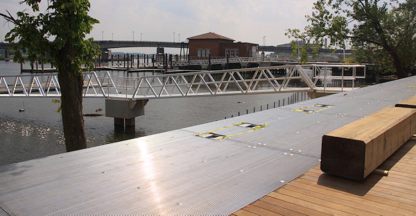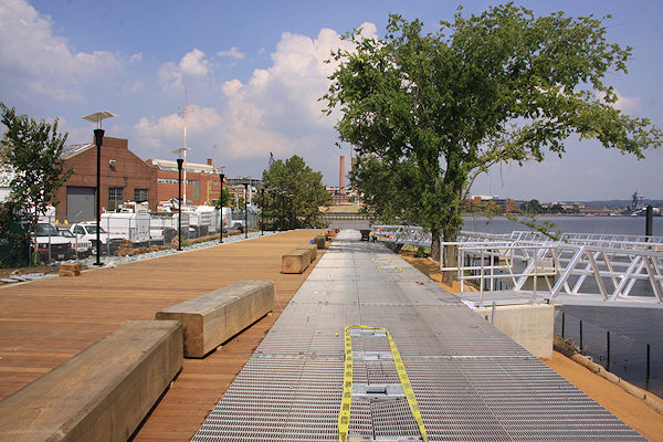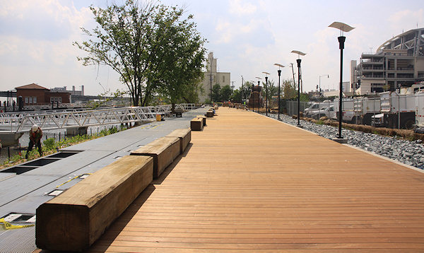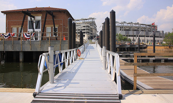 Let's pretend you're arriving by water taxi. This is the view of the shoreline as ships arrive at the docks, with the walkway to the land-based portion of Teague Park at left, Nationals Park looming at rear, and the floating walkway at right. (They haven't yet installed the plantings along the shoreline.) The red buildings at rear are owned by WASA, and someday the park will be extended into that property, but not anytime soon.