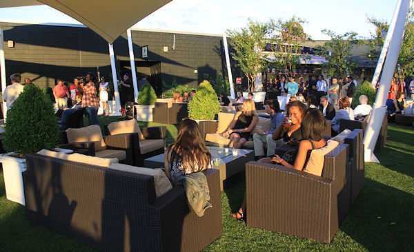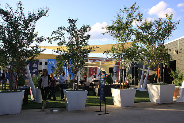 The seating area, with synthetic turf and some of the 15 trees brought to the space. (link)