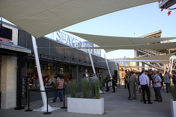 Looking down the row of restaurants, showing the sails that will help shade fans while standing in line. They are designed to reduce the ambient temperature by up to 20 degrees. (link)