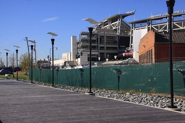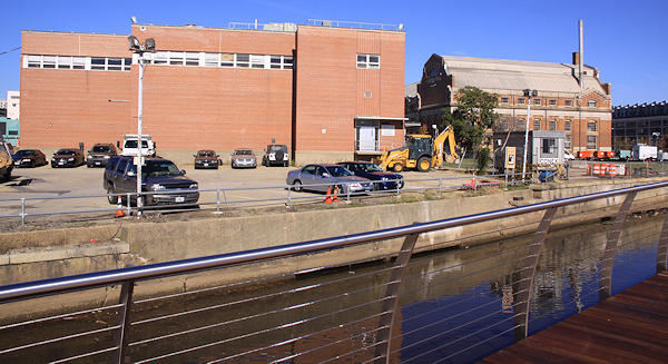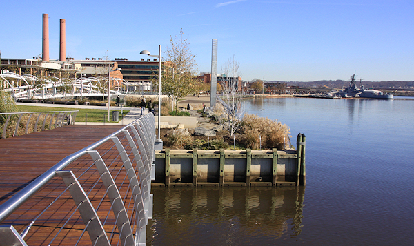 DC Water operations on the bridge's north side, with Nationals Park peeking out from behind.)
