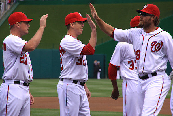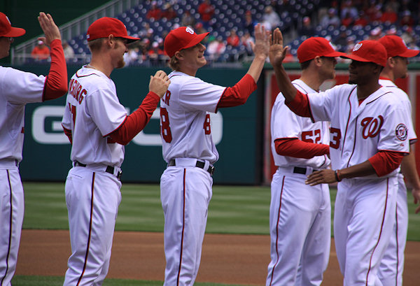 Pitcher Edwin Jackson gets his high-five from Ross Detwiler, with Stephen Strasburg and Tyler Clippard waiting their turn.    (link)
