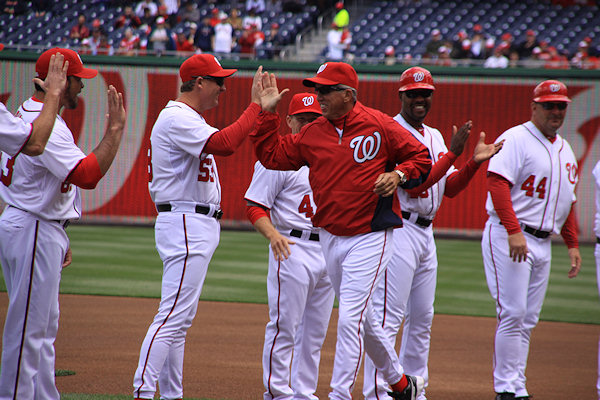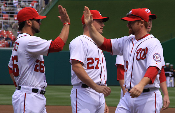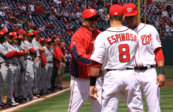 Davey greets Danny Espinosa, while Ian Desmond and the Reds watch.    (link)