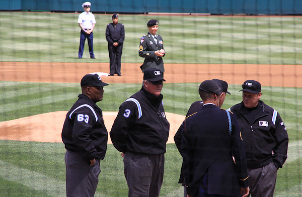 Honored members of the armed forces wait in their on-field positions while the umpires sort out a few things.    (link)