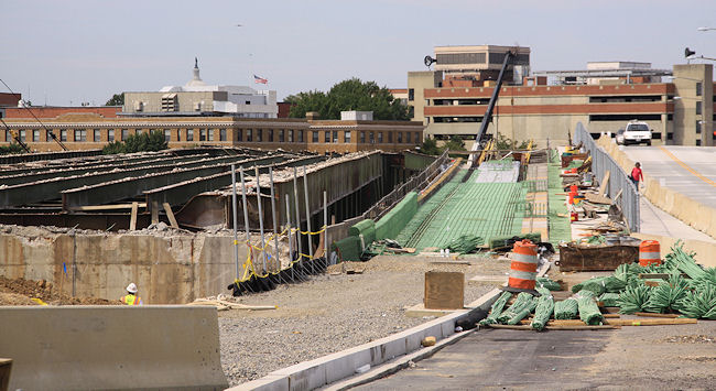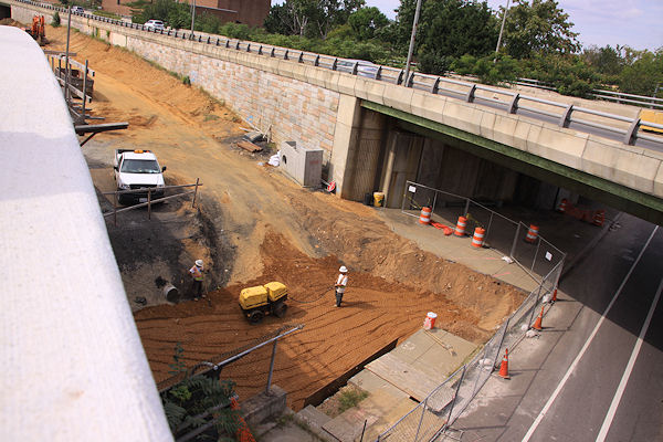 An overhead view rom above 11th Street of the sunken Southeast Freeway lanes. The right lane seen here has already been closed, and by early 2013 all traffic in both directions will be closed to begin work on the