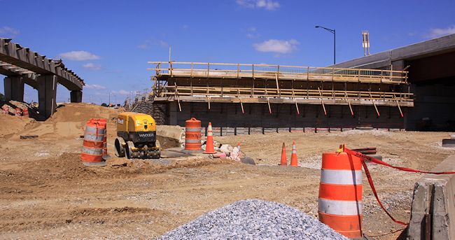 go here and look at the graphics.) At center/right is the construction of what will be the new flyover ramp to the outbound 11th Street freeway bridge. And at far left is the renmantz of the old outbound flyover.