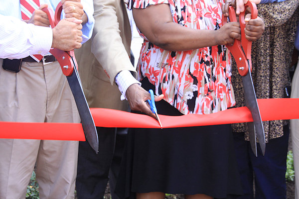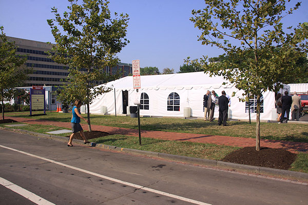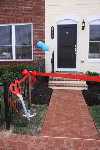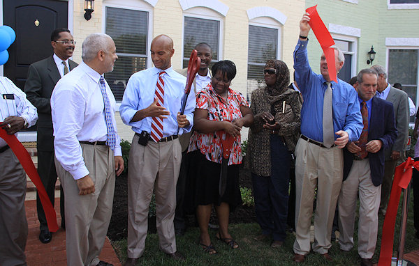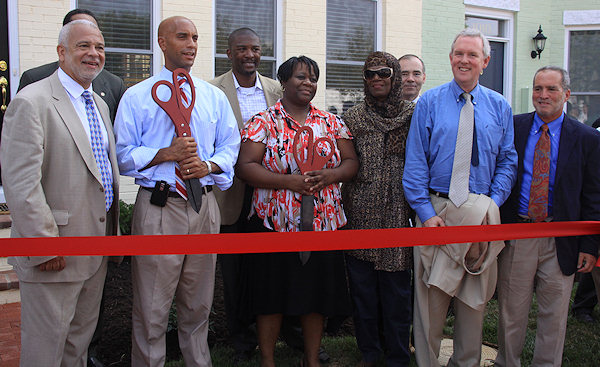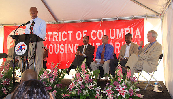 The mayor speaks, while other speakers (Harry Sewell of the DC Housing Finance Agency, Scott Nordheimer of Urban Atlantic LLC, Brian Alan Jackson of EYA, and council member Tommy Wells) look on. (link)