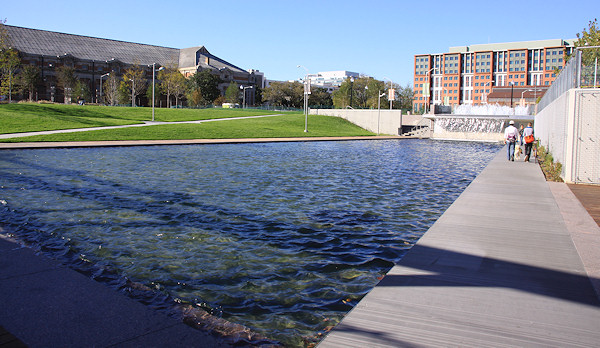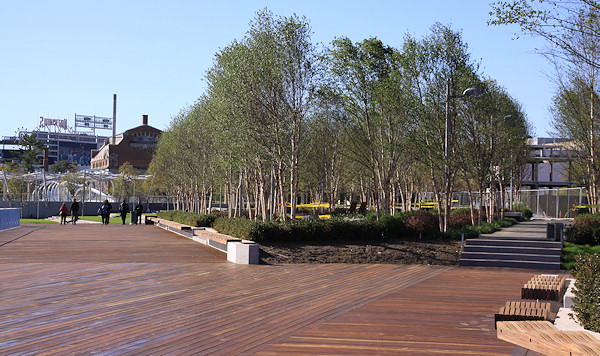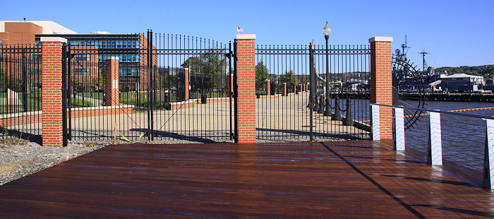 The eastern end of the boardwalk, ending at the Navy Yard's fence. The Navy Yard's portion of the boardwalk was built in the early 2000s, and takes you to the Display Ship Barry and then to 11th Street, SE. Talks are on-going to get this fence opened, but the Navy Yard has security concerns that will have to be addressed first.