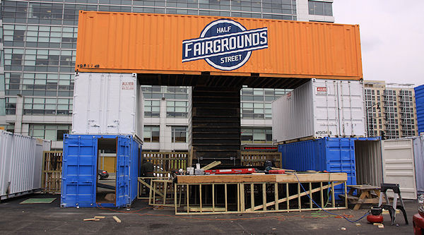 Looking down at the stage, and some of the vendors' container spaces. (link)