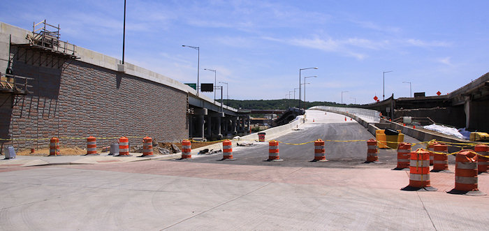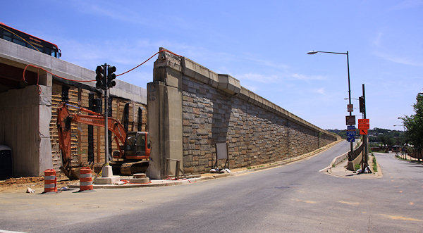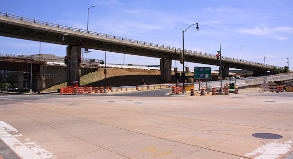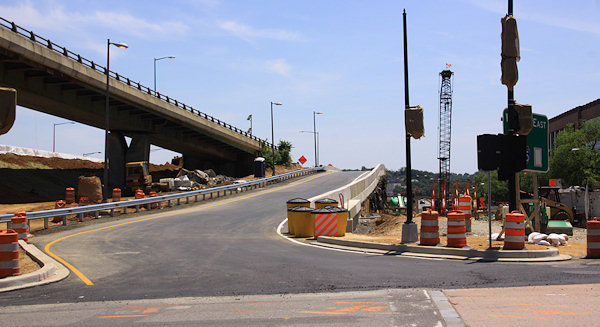 One block to the south, at 11th and N, demolition work is underway (left) while the ramp to the old outbound 11th Street Bridge remains in operation. Soon traffic will be coming northbound through the demolished area to head toward 11th and M, and the ramp will also be demolished to bring 11th Street to its new final alignment and width.