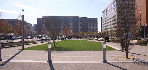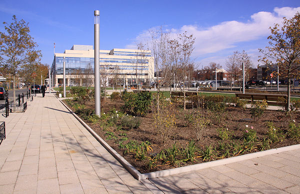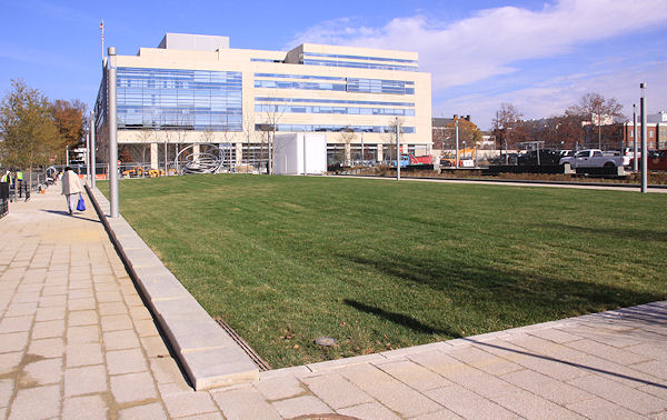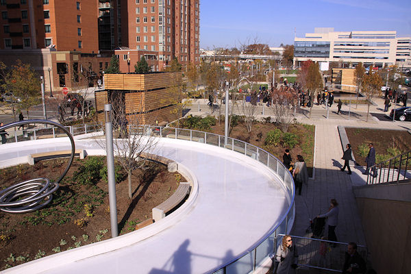 The south end of the ice rink, with the fountains that will be lit and synchronized to music at night, and will be available for kids to run through in the summertime. (link)