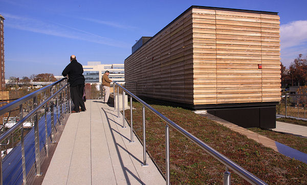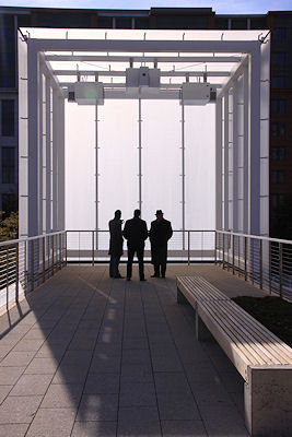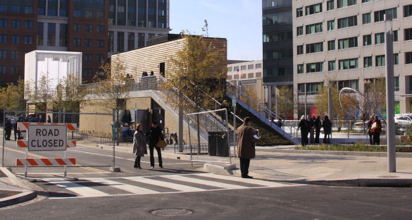 The middle block's pavilion and water feature, with the crowd gathered for the ceremony at right. (link)