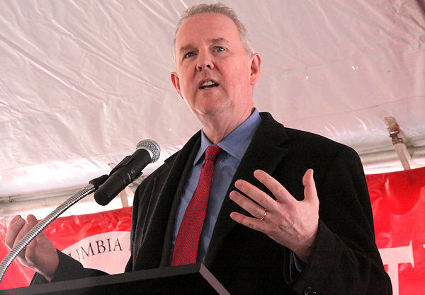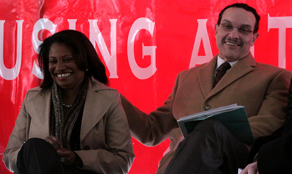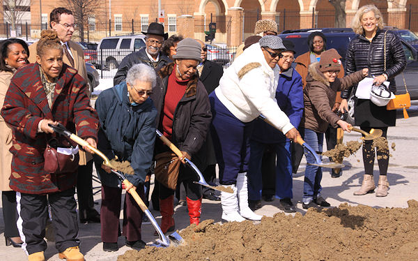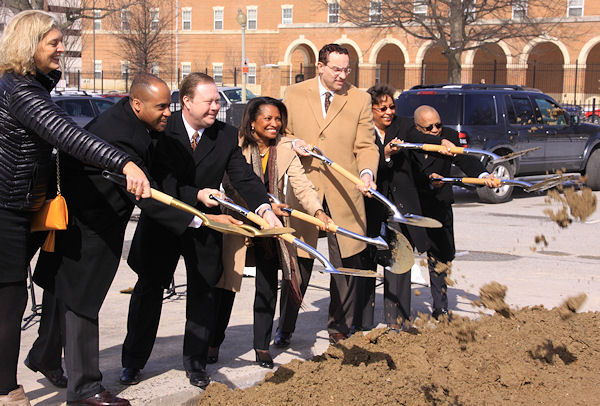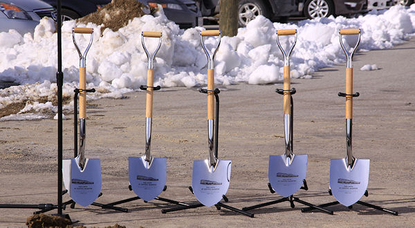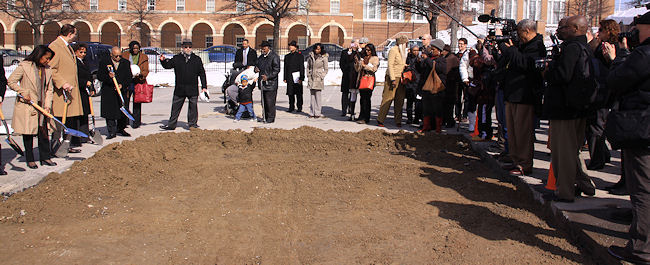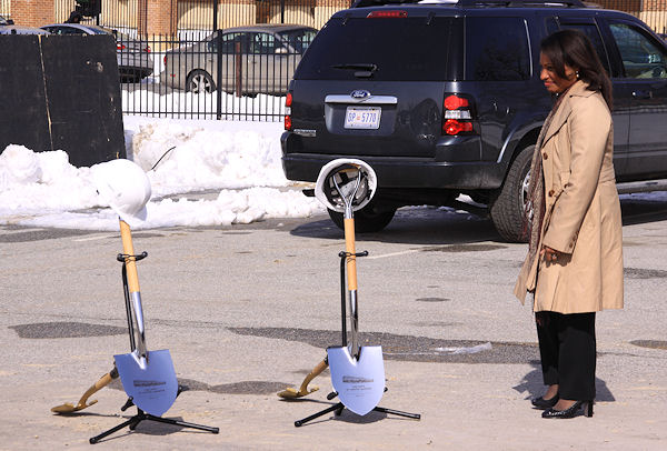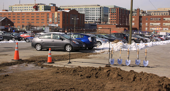 The shovels await the VIPs at the site of what will be the Lofts at Capitol Quarter, on what's now a parking lot just north of the Navy Yard and east of Van Ness Elementary (right) and the new Twelve12 apartment building with the ground floor Harris Teeter (center). This used to be where the towering