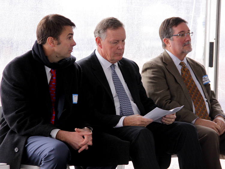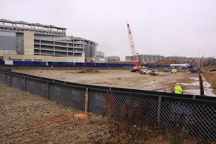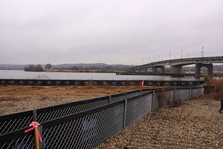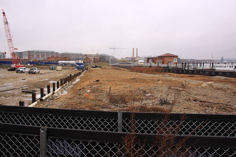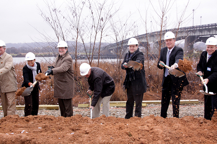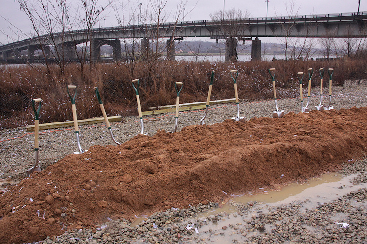 The post-groundbreaking view of the ceremonial shovels, along with a hint of the breadth of the site's view up the Anacostia River. (link)