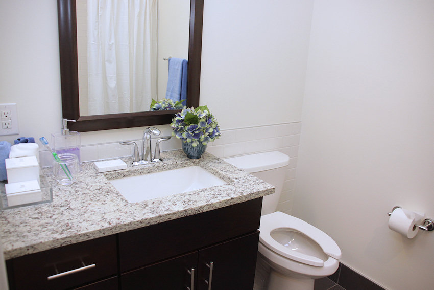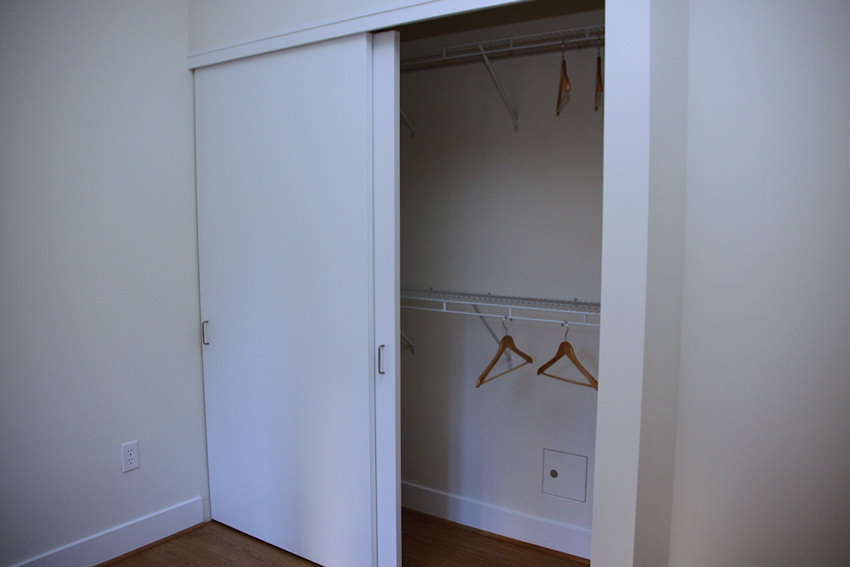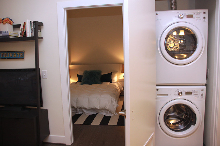 Peeking into the bedroom while also peeking at the full-size washer and dryer, standard in every unit (though some units have them side by side). (link)