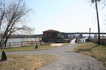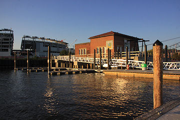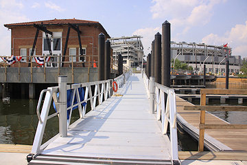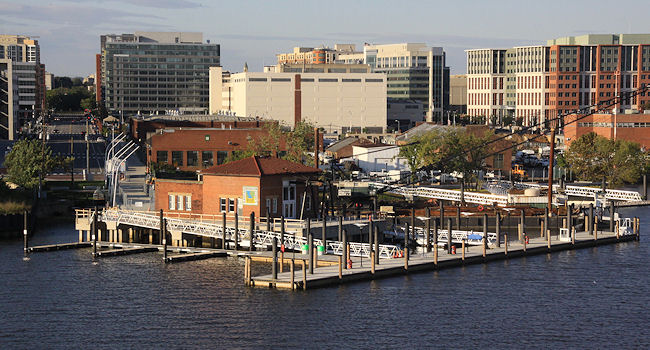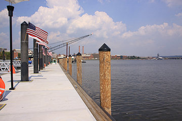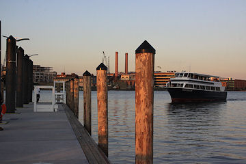 The water taxi pier, with its view of the Navy Yard, the display ship Barry, and the
