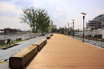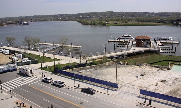 To the right on the way up the gangplank is a view of in-water plantings and the floating boardwalk, with the Yards Park footprint at rear. (8/27/09)