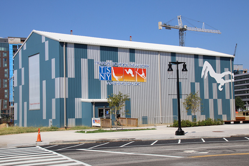 temporary plan for the site (technically known as Parcels A, F, and G), the Trapeze School New York's DC location has moved from 4th and Tingey to the northwest corner of New Jersey and Tingey, into this not-quite-so-spooky structure.