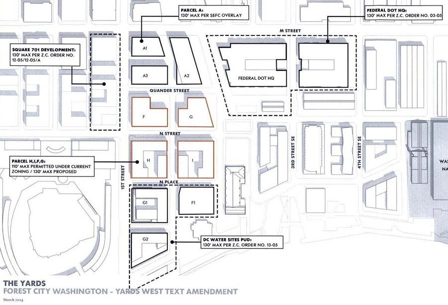 A map from a 2014 zoning filing that shows the locations of "Yards West"--Parcels A, F, and G north of N, and H and I south of N--in relation to Nationals Park and the rest of the Yards.