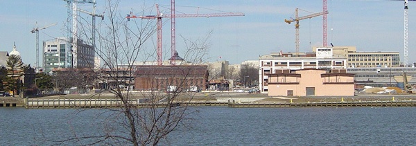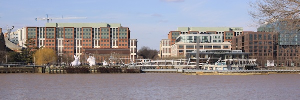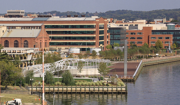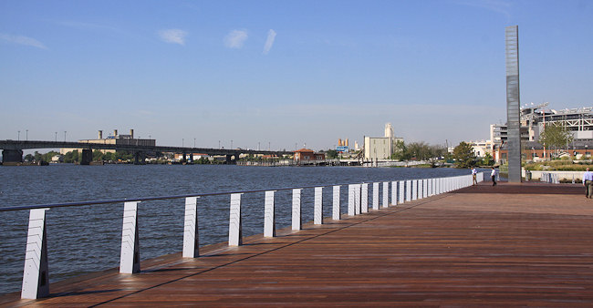 The boardwalk and the light tower, looking toward Diamond Teague Park and the Florida Rock site and the Douglass Bridge (and Buzzard's Point in Southwest) in the distance. (9/7/10)