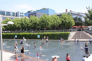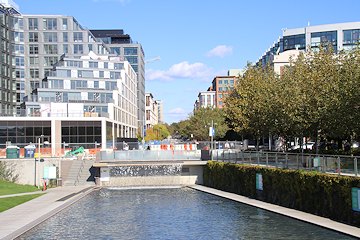Nov 3, 2019 - The same location, showing off the canal basin, the waterfall, and the fountains at the Third Street Plaza.