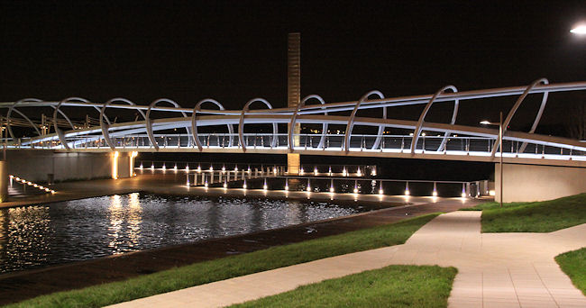 Another nighttime look at the park, showing the canal basin, the pedestrian bridge, and the light tower. For more shots of the park after dark,