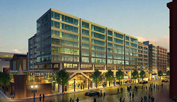 The original Parcel D designs, unveiled in 2007, called for 320,000 sq ft of office space above the supermarket, and a separate residential building, 400 Tingey, with 170-190 apartments. Designs by Shalom Baranes Associates.