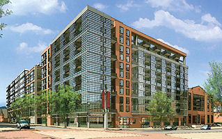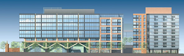 A view of the previous designs for Parcel D, showing the western side of the development, which would face 4th Street. At far left is the sentry tower at M Street. The grocery store is still planned for the ground-floor area at left, but in 2010 the site plan was redesigned to be a single all-residential building with ground-floor retail. These 2007 designs by Shalom Baranes Associates.