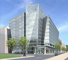Left) A rendering of "SC1100", a 350,000-sq-ft office building proposed for the southeast corner of South Capitol and L streets, developed by the Ruben Companies and designed by Shalom Baranes Associates. (Rendering courtesy of the