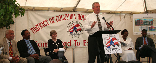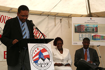 DCHA commission chair Franklin Smith speaks to the assembled crowd; at far right is a graphic showing how the affordable housing units are integrated into the townhouses so that from the outside all the differing income-level units look the same. (6/26/07)