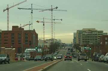 Driving West: M Street just east of its intersection with Hull Street, in December 2004. The Navy Yard is to the left, and the cranes mark the DOT HQ construction. (12/04)