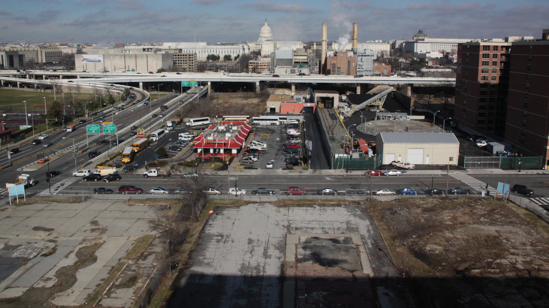 Jan. 12, 2012 - The block where 909 Half is being built runs across the bottom of this photo, taken from the top floor of 1015 Half Street in 2012. At least until the McDonalds and the feds' operations related to the coal plant are replaced with tall buildings, 909 should have a good view of the Capitol dome from its higher floors. The 909 Half footprint is on the right portion of the block.