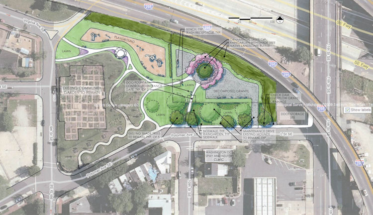 Three-block park on the site of the old Washington Canal. Construction begun in spring 2011, opened Nov. 16, 2012.