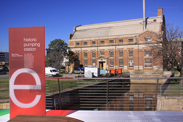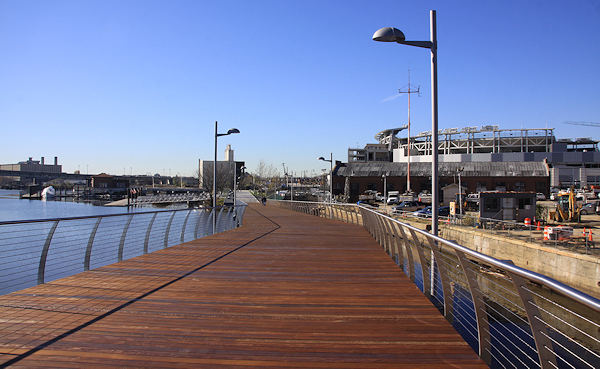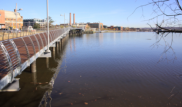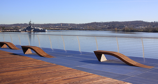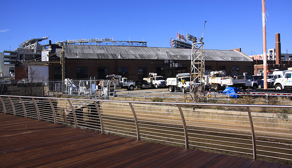 DC Water operations on the bridge's north side, with Nationals Park peeking out from behind.)