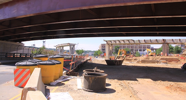 And the view southward on 11th, from beneath the new inbound flyover. You can also see how the far left side of the street is still a bridge, while the right side is now the dirt that has been filled in.