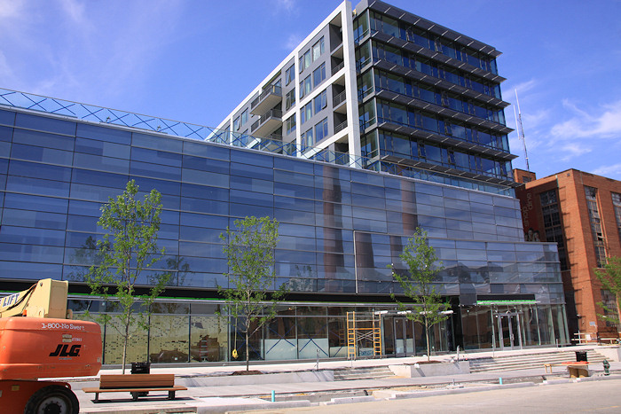 The entrance to Vida, and the eastern residential tower. And the reflection of the Navy Yard smokestacks.