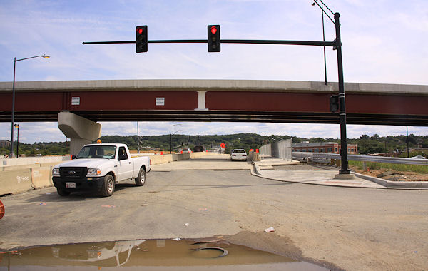 Looking east at the about-to-open intersection on the 11th Street Local Bridge with the new ramp to southbound I-295 (ramp C-3). When these two intersections open, pedestrian and bike traffic will be routed onto the sidewalk at right.