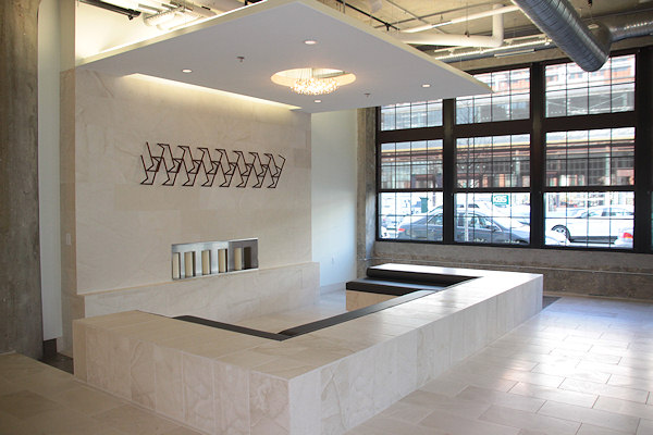 The lobby's seating area, with windows looking out on Tingey Street and the Boilermaker Shops.