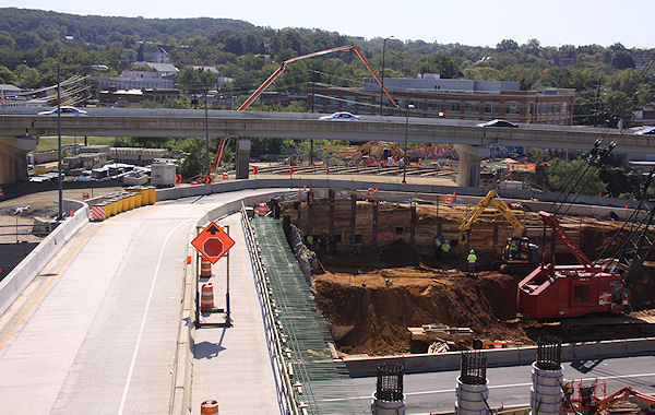 The new bridge that will cross DC 295 and connect to Martin Luther King Jr. Ave. is partially completed, with the rebar visible on its right side in preparation for the second half of construction. The girders for the approach to MLK and downtown Anacostia are also visible at rear.