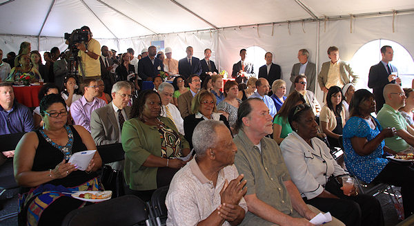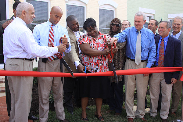 The mayor speaks, while other speakers (Harry Sewell of the DC Housing Finance Agency, Scott Nordheimer of Urban Atlantic LLC, Brian Alan Jackson of EYA, and council member Tommy Wells) look on. (link)